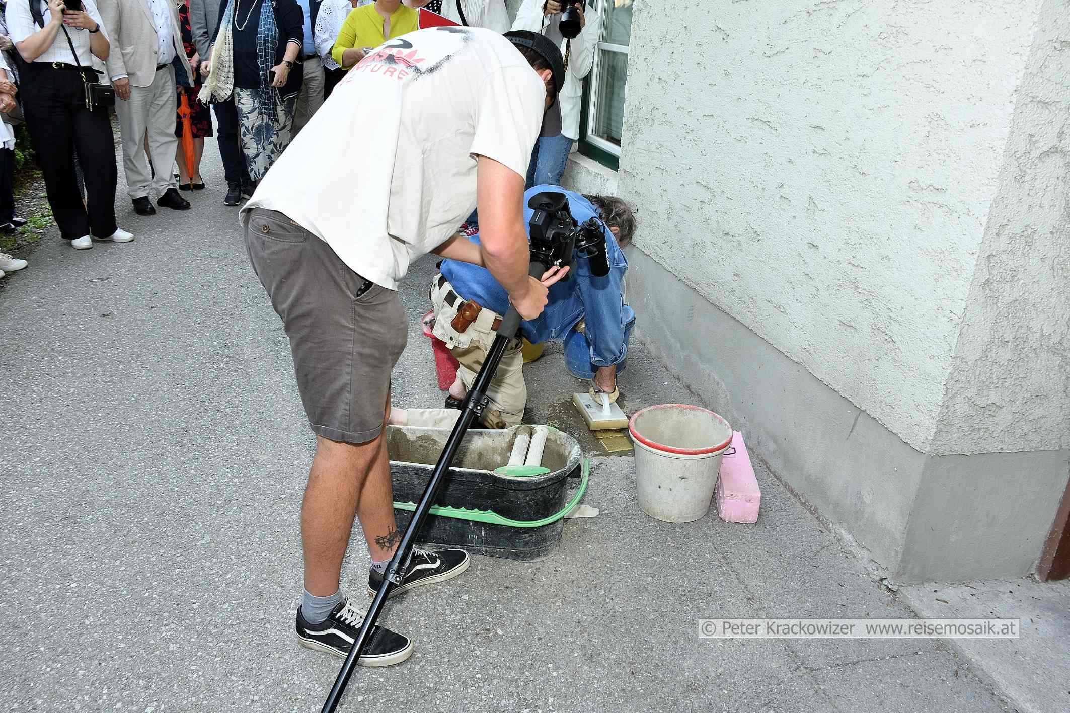- Stolpersteinverlegungen in Schladming im Juli 2023 am westlichen Rand des Rathausparks in Schladming. Hier verlegt Gunter Demnig die Stolpersteine für die Familien Weiss und Zucker.