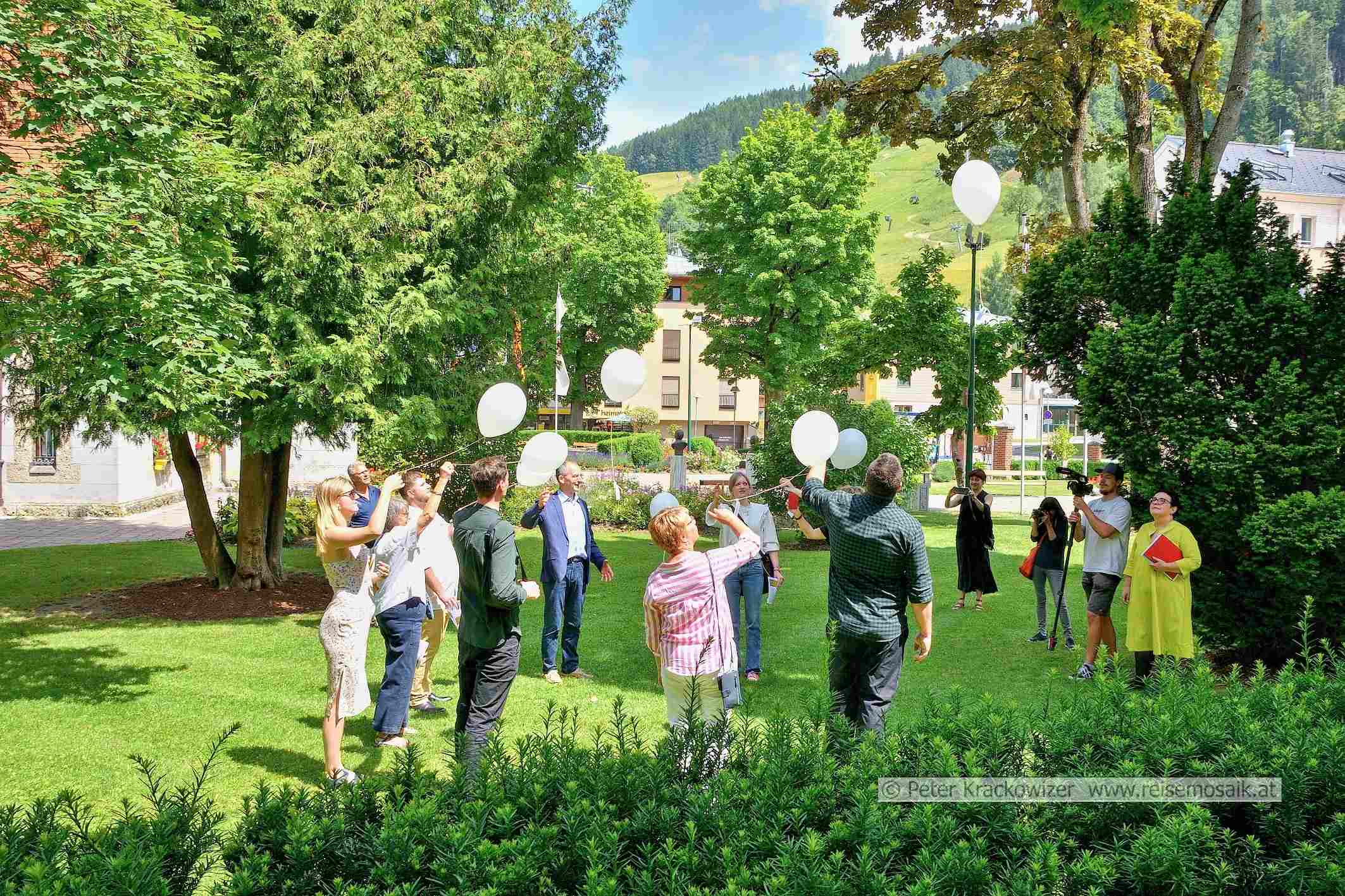 Stolpersteinverlegungen in Schladming im Juli 2023 am westlichen Rand des Rathausparks in Schladming. In Erinnerung an eine Luftballon-Aktion vor 20 Jahren ließen Familienangehörige zum Abschluss dieser Stolpersteinverlegungen ebenfalls weiße Ballone mit diesem Brief in den Schladminger Himmel steigen.