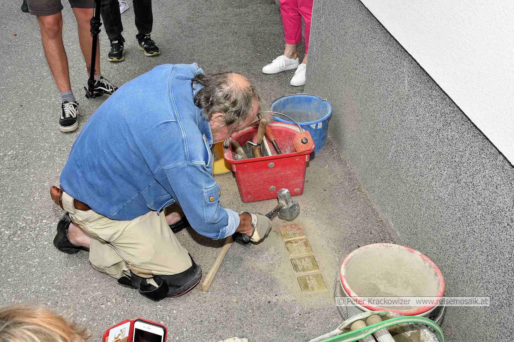 Stolpersteinverlegungen in Schladming im Juli 2023 vor dem Haus Nr. 100 an der Dachsteingasse in Schladming. Bei der Verlegung der Stolpersteine von Gunter Demnig.