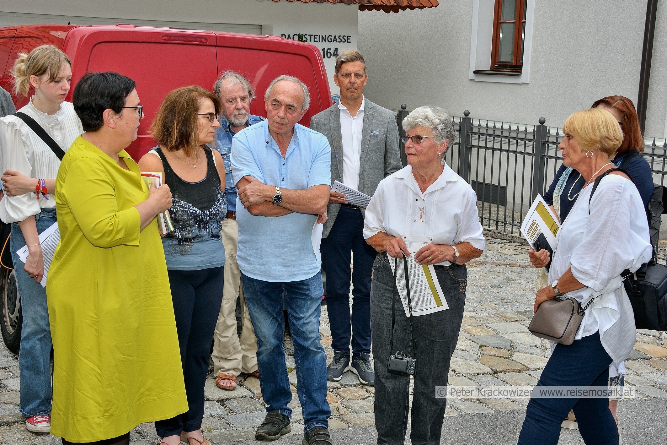 Stolpersteinverlegungen in Schladming im Juli 2023 vor dem Haus Nr. 100 an der Dachsteingasse in Schladming. Monika Faes mit dem Hausbesitzer-Ehepaar von Dachsteingasse 100 sowie Edith Kohlross, Enkelin von Karl Eisler und ihre Tochter Nora Gehringer.