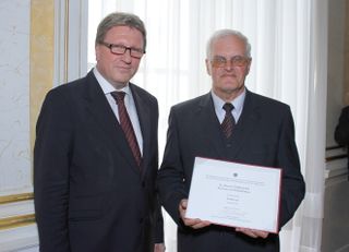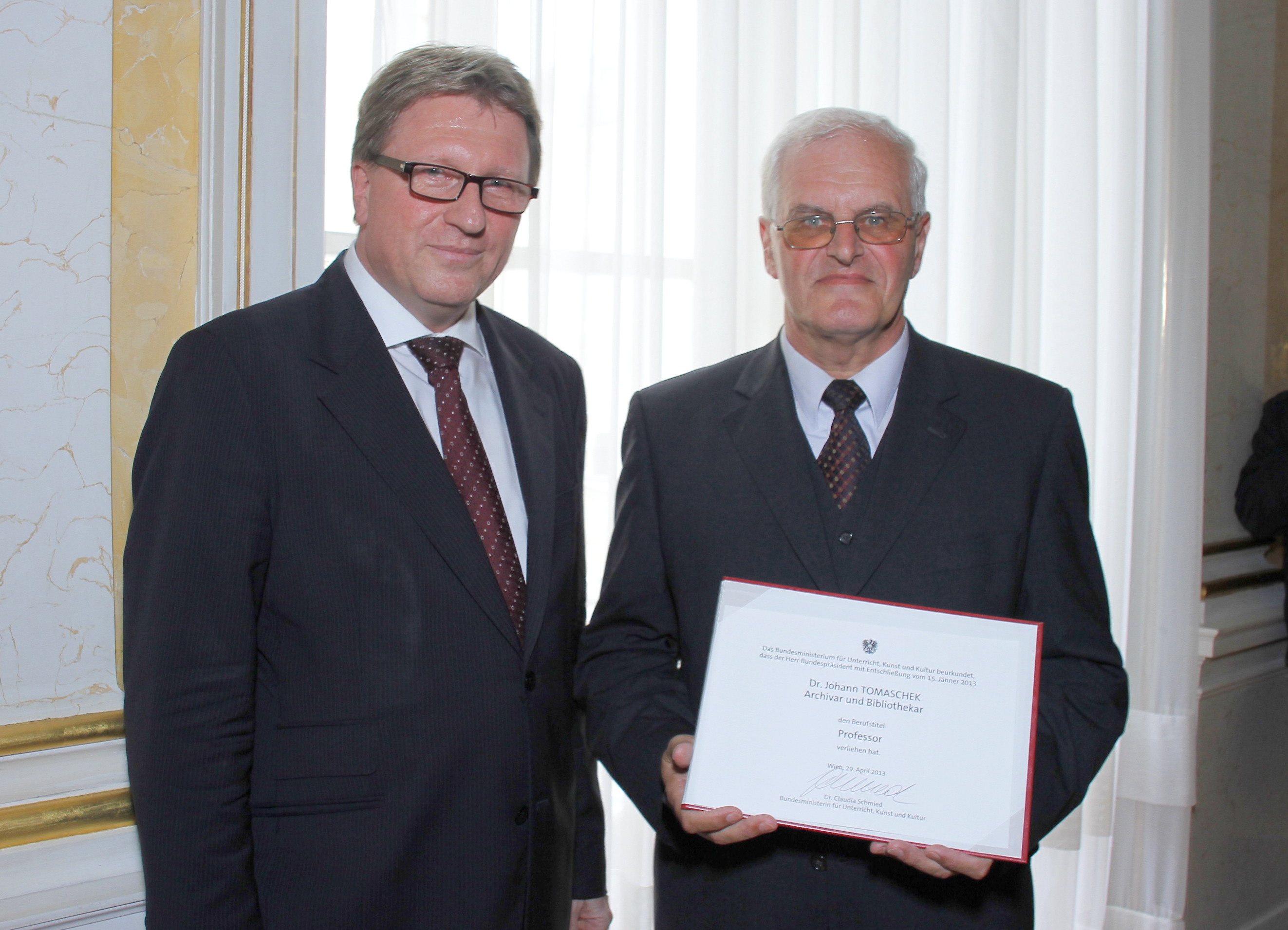 - Prof. Dr. Johann Tomaschek des Benediktinerstifts Admont (rechts) mit SChef Kurt Nekula, M.A. anlässlich der Verleihung seines Berufstitels "Professor"