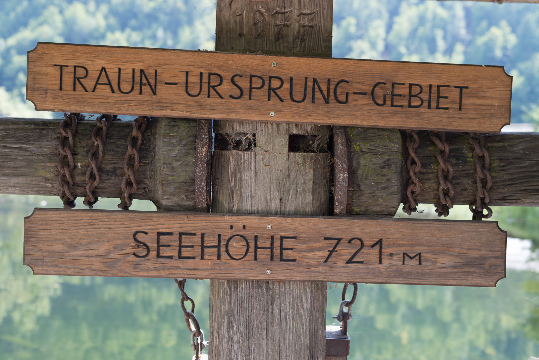 Schild 'Traun-Ursprung-Gebiet' beim Wehr am Toplitzbach
