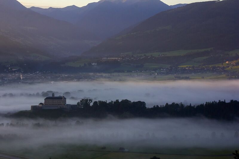 - Das Schloss Trautenfels im Morgennebel. Der Blick geht nach Süden über Irdning in das Donnersbachtal.