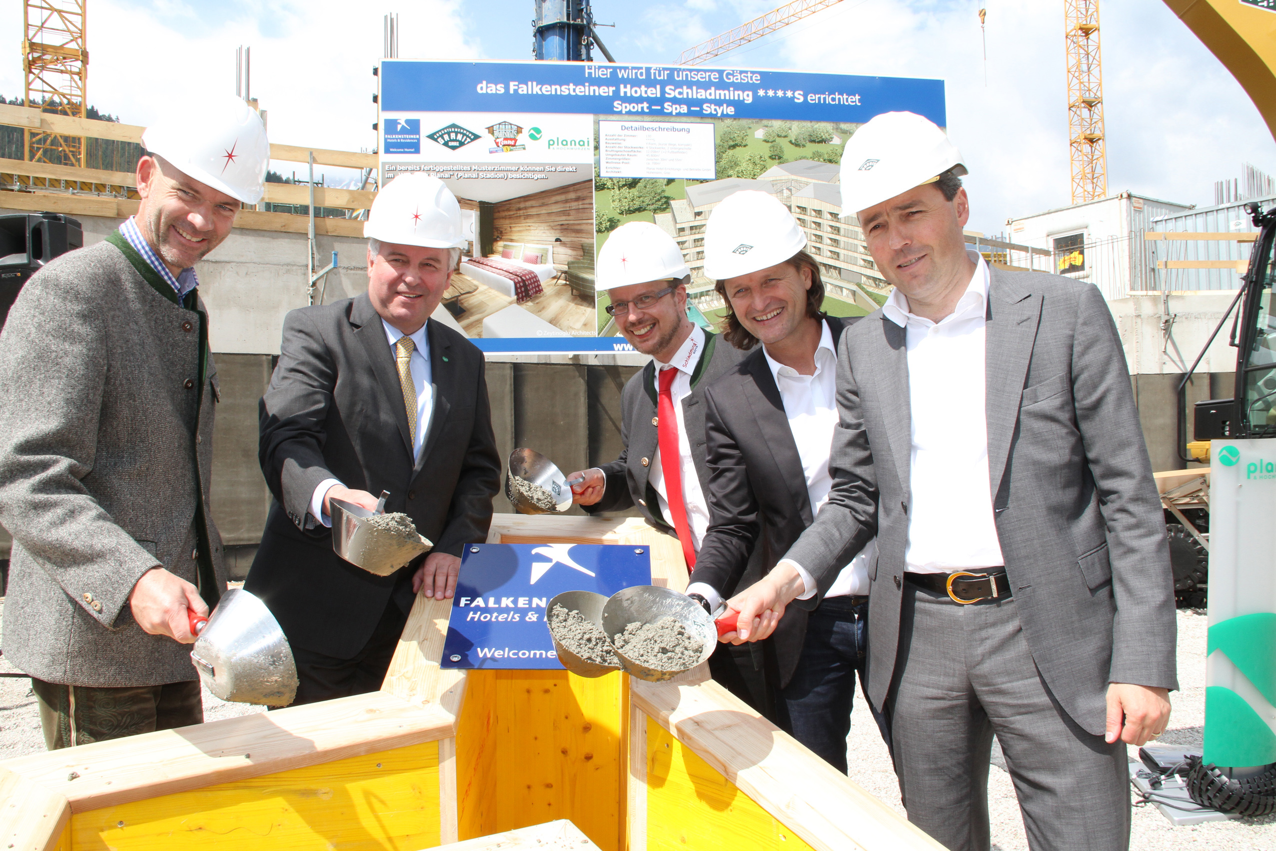 - v.li: Bürgermeister der Stadt Schladming, Jürgen Winter, Landeshauptmann-Stv. Hermann Schützenhöfer, Planai-Hochwurzen-Bahnen GmbH -Geschäftsführer Mag. Ernst Trummer, Ing. Günther Lederhaas von Granit und Dr. Otmar Michaeler, CEO Falkensteiner Michaeler Tourism Group bei der Grundsteinlegung des Bauvorhabens Top-Hotel Schladming am 23. Mai 2012