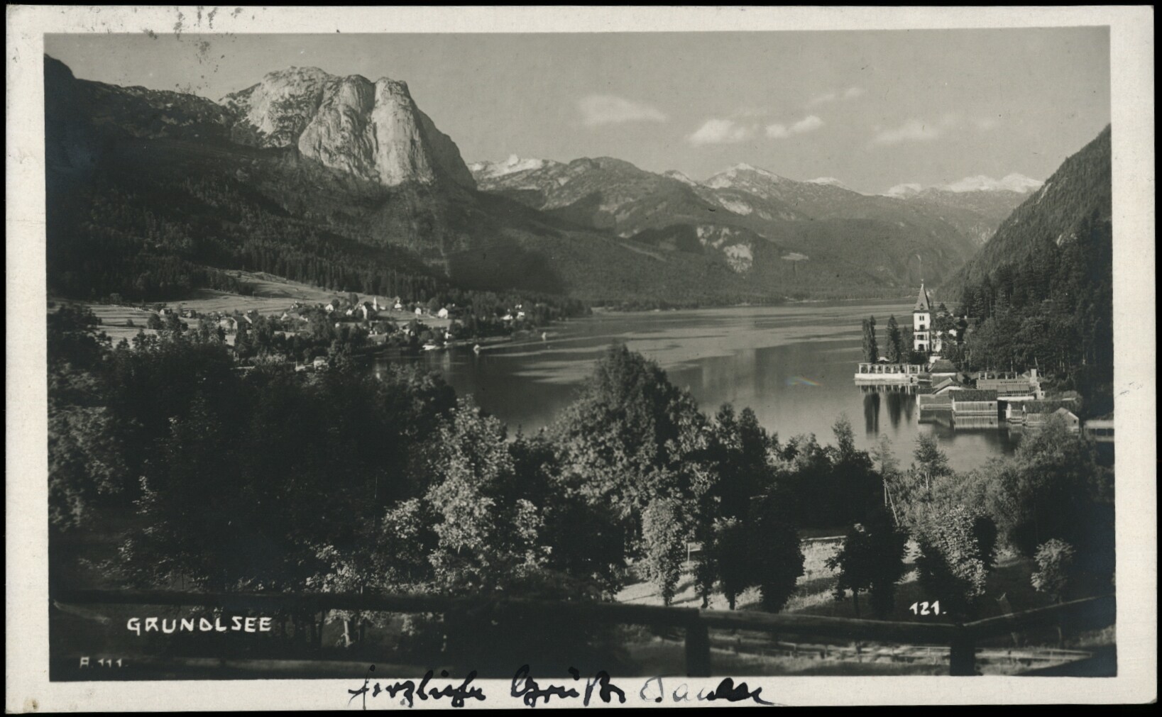 - Historische Ansichtskarte vom Grundlsee mit links dem Ort Grundlsee und rechts der Villa Castiglioni.