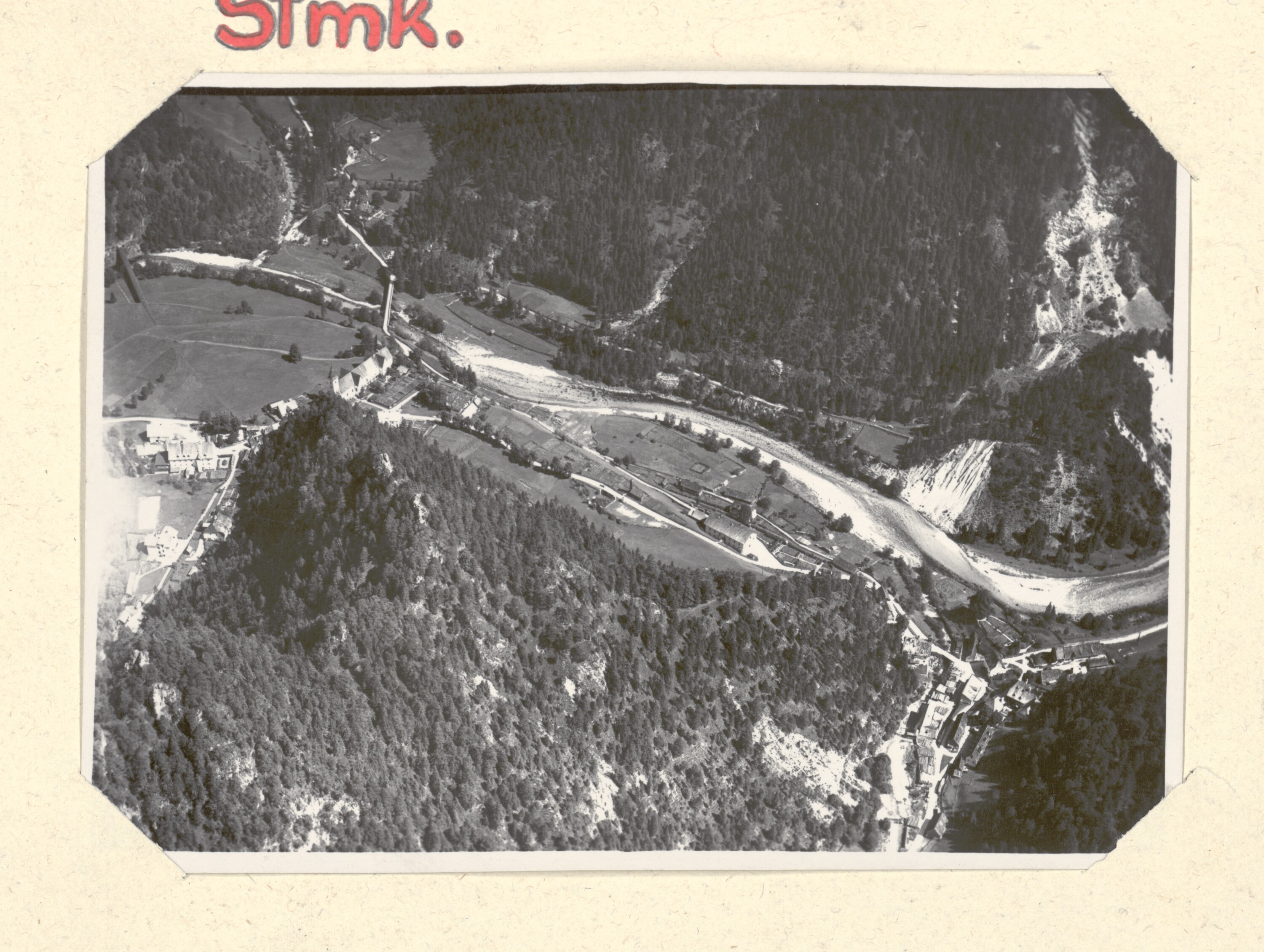 Blick auf Wildalpen. Links oben die katholische Pfarr- und Wallfahrtskirche Zur Schmerzhaften Gottesmutter und rechts unten das Tulleck'sches Hammerwerk. Der Fluss ist die Salza. Aufnahme zwischen 1928 und 1938.