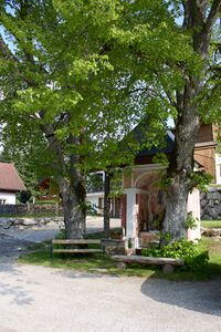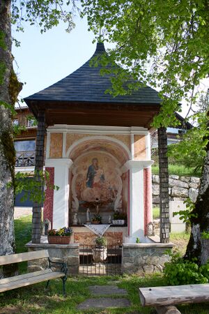 Die Kapelle steht zwischen zwei Bäumen am Parkplatz vor dem Gasthof Dachsteinblick auf 1 050 m ü. A..
