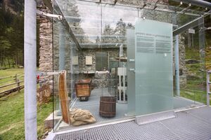 sowie u.a. 500 Torstahlspitzen, 95 Stück Rundeisen, 360 m Blech, 150 m Lärchenpfosten, 150 m Seilnetz, 300 m Seilgeländer, 80 m³ Schotter, 75 einzelne Gitterroststufen;